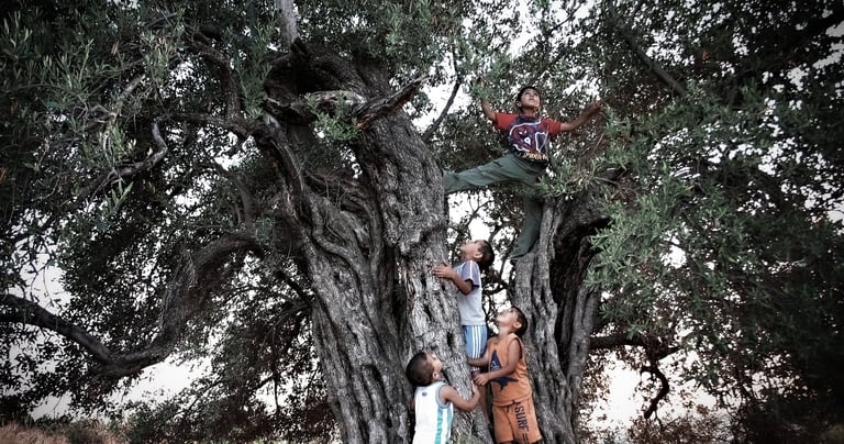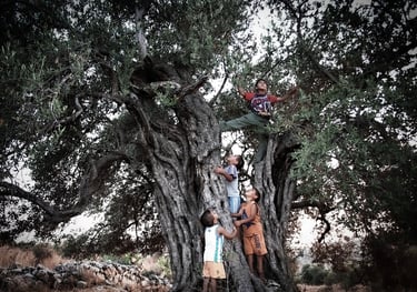 The bond between generations and the olive tree, where children grow strong beside the roots that have stood for centuries.