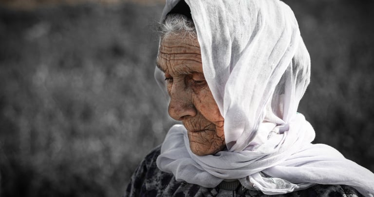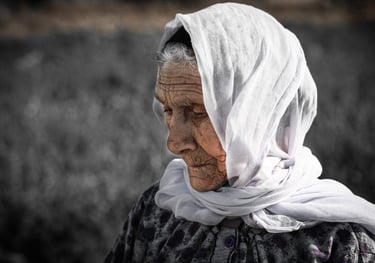 The wisdom and pain of generations, where every wrinkle tells a story of endurance, loss, and unbreakable hope.